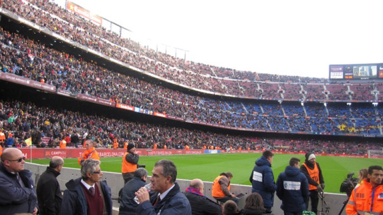نزلنا على بعد أمتار قليلة من الملعب رفقة المئات من المناصرين الذين يسيرون على أرصفة الشوارع بشكل منظم، في منظر يوحي بأن هناك شخصا ما يقودهم ويوجههم، يقطعون الطرق عند اشتعال الضوء الأخضر ويتوقفون عند الإشارة الحمراء، اقتربنا من الملعب الذي يتسع لقرابة 100 ألف متفرج، وكل المشجعين يدخلون ويخرجون منه كأسراب النحل أو خطوط النمل في تنظيم متناسق، يعكس الكم الهائل من المناصرين المولعين بمشاهدة نجومهم في فريق برشلونة على ملعب نو كامب، الذي يعني اسمه بالعربية “الملعب الجديد” الواقع وسط مدينة برشلونة الإسبانية.