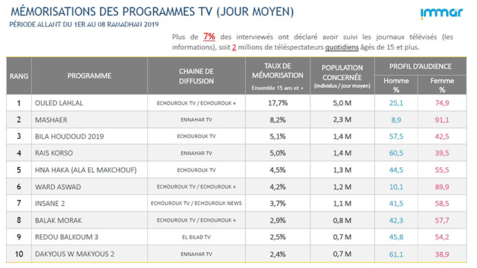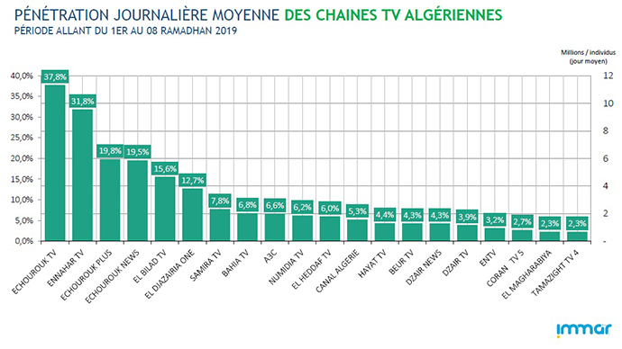 وحسب دراسة استطلاعية جديدة أنجزها معهد “ايمار IMMAR”، شملت ولايات مختلفة من ربوع الوطن، فقد حصدت “الشروق تي في” نسبة 37.8% في المرتبة الأولى من حيث المشاهدة خلال الفترة من 01 إلى 08 رمضان الجاري، حيث ارتفعت نسبة متابعتها بـ0.3% مقارنة برمضان 2018، متفوقة على “النهار تي في” التي جاءت في المرتبة الثانية بنسبة 31.8% تليها “الشروق بلوس” و”الشروق نيوز” بـ19.8% و19.5 على التوالي، لتسيطر “الشروق” بقنواتها على قائمة “توب 4” لدى المشاهدين في مختلف مناطق الوطن وحسب معيار العمر والجنس. وتمركزت “الجزائرية الثالثة” في المرتبة التاسعة بنسبة 6.6%، ثم “نوميديا تي في” بـ62%، فيما تذيلت “دزاير تي في” والقناة الأرضية قاع الترتيب.
