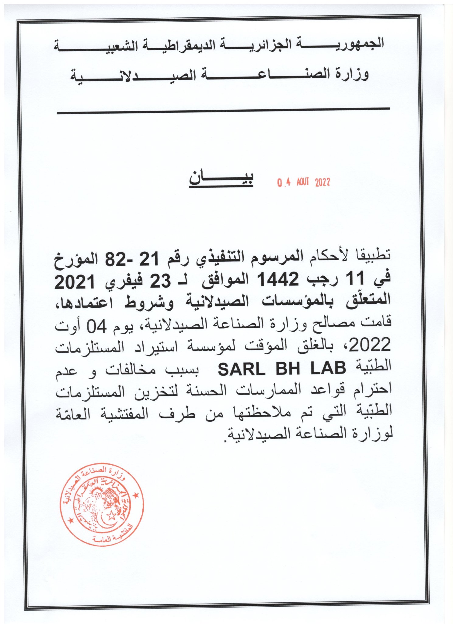 وأفاد بيان للوزارة، أنه “تطبيقا لأحكام المرسوم التنفيذي رقم 21 ـ 82 المؤرخ في 23 فيفري 2021 المتعلق بالمؤسسات الصيدلانية وشروط اعتمادها، قامت مصالح الوزارة اليوم الخميس 4 أوت بالغلق المؤقت لمؤسسة استيراد المستلزمات الطبّية SARL BH LAB”.