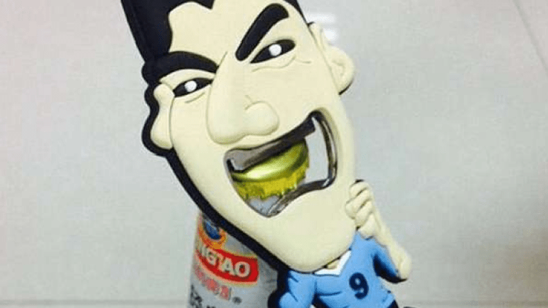 وباتت فتّاحات قوارير تحمل صورة لاعب كرة القدم الأوروغوياني لويس سواريز الذي أثار صدمة من خلال عضّه المدافع الإيطالي جورجيو كييليني في مونديال البرازيل، متوافرة الآن بالآلاف على مواقع بيع صينية عبر الإنترنت.