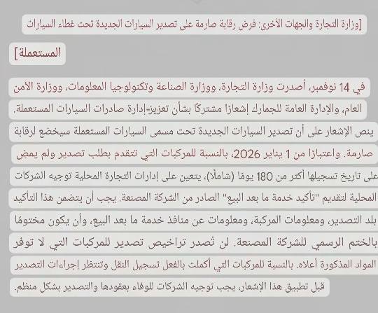 باختصار، ولتصحيح الإشاعة المنتشرة لا يوجد أي قرار من الحكومة الصينية يمنع تصدير السيارات الصينية ابتداءً من سنة 2026 وما تم تداوله هو فهم خاطئ لقرار تنظيمي جديد.