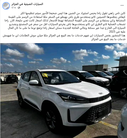 ومن المرجح أن يدفع هذا المستهلكين إلى شراء سيارات جديدة من الوكالات الصينية المتوفرة في الجزائر على غرار جيلي وشيري، ما يفتح فرصة لتعزيز حصتهم السوقية.