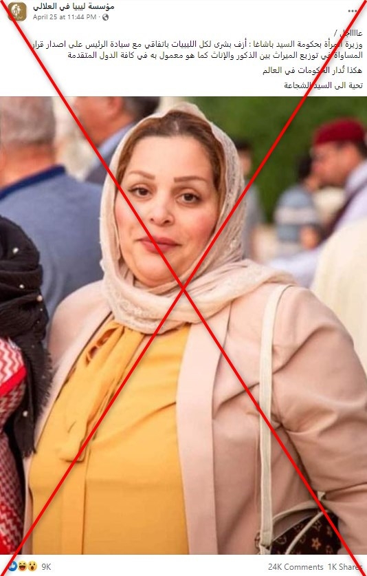 وكشفت مصادر في ذات الوزارة لصحفيي خدمة تقصي الحقائق في موقع ” فرانس براس”أن ” قرار يساوي في توزيع الميراث بين الذكور والإناث”، والمنسوب لوزيرة الدولة لشؤون المرأة الليبية، انتصار عبود، غير صحيح.