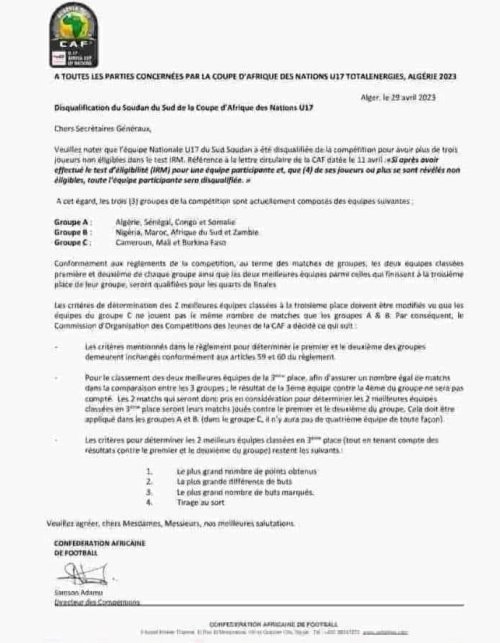وقبل الإقصاء، كان يُفترض أن يُنافس منتخب جنوب السودان أشبال فرق الكاميرون وبوركينا فاسو ومالي، في الفوج الثالث بِملعب “19 ماي 1956” بِعنابة.