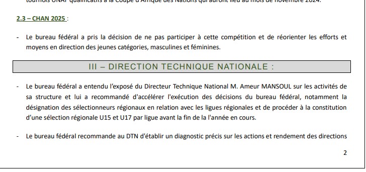 وخلال اجتماع المكتب الفيدرالي تقرر رسميا عدم المشاركة في “الشان”، وتوجيه الإمكانات لمختلف منتخبات الفئات الشبانية ذكور وإناث.