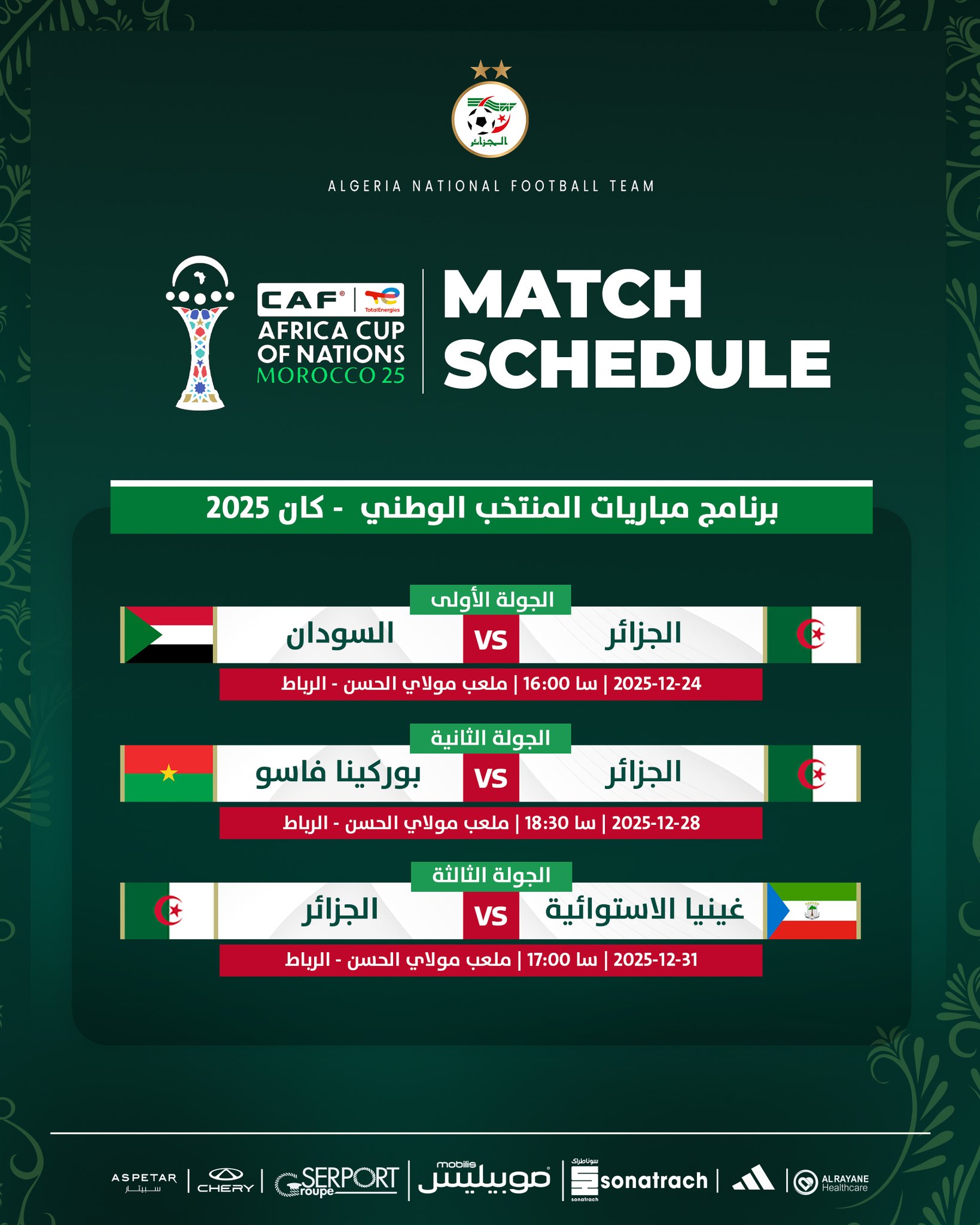 ويستهل “الخضر” مشوارهم في “الكان”، بمواجهة السودان يوم الأربعاء 24 ديسمبر 2025 ، بداية من الساعة الرابعة عصرًا.