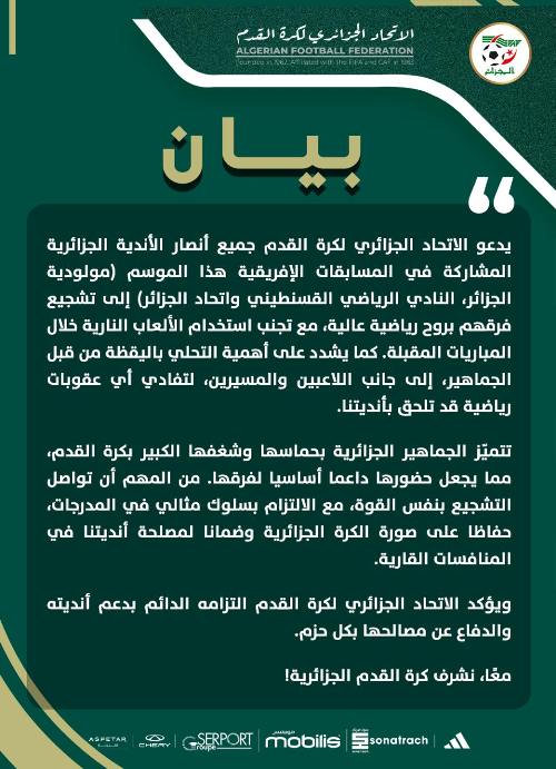 “الفاف” تُخاطب أنصار المولودية وسوسطارة والسنافر