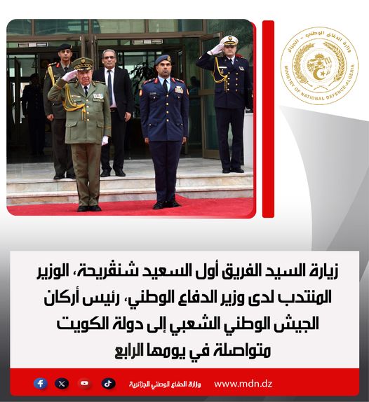 وجاء في بيان لوزارة الدفاع، “زيارة السيد الفريق أول السعيد شنڨريحة، الوزير المنتدب لدى وزير الدفاع الوطني، رئيس أركان الجيش الوطني الشعبي إلى دولة الكويت متواصلة في يومها الرابع”.
