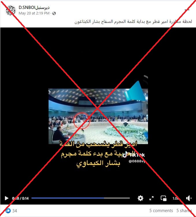 وأكد تقرير الوكالة الفرنسية أن الفيديو مركب، لافتا أنه بعد ظهر الجمعة، أعلن الديوان الأميري القطري أن الشيخ تميم غادر مدينة جدّة “بعد ترؤسه وفد دولة قطر في القمّة العربيّة”، لكنّه لم يغادر أثناء كلمة الأسد.