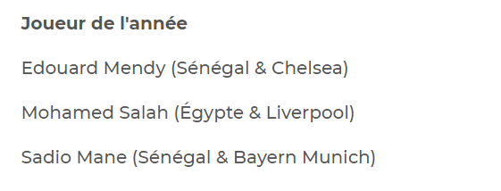 وتضمّ القائمة أيضا 5 لاعبين من السنغال. و4 لاعبين مصريين، يتقدّمهم نجم ليفربول محمد صلاح. و4 مغاربة، منهم أشرف حكيمي، والحارس ياسين بونو.