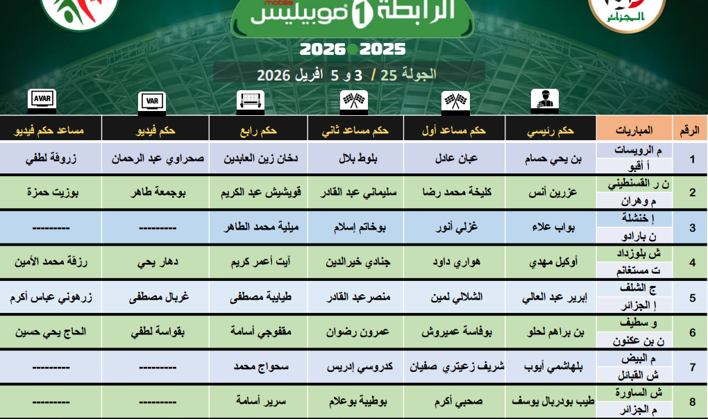 عيّنت اللجنة الفيدرالية للتحكيم حكام مباريات الجولة 25، من الرابطة المحترفة الأولى.