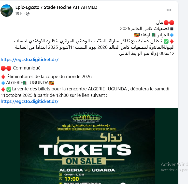 كشفت إدارة ملعب حسين آيت أحمد بتيزي وز، عن موعد انطلاق عملية بيع تذاكر مباراة الجزائر وأوغندا.