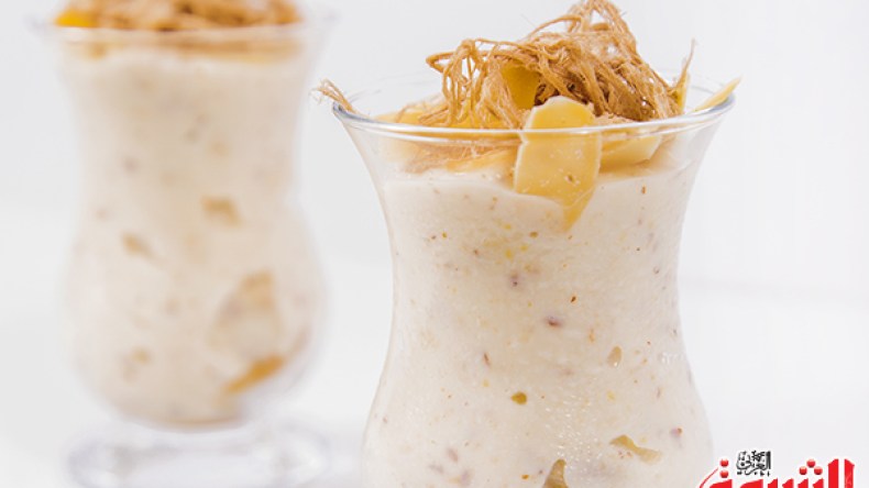 المقادير:·03 أكواب حليب·01 كوب جوز الهند محمص· نصف كوب لوز·50 غ زبيب· 03 حبات هيل·¾ كوب سكر·02 صفار بيض·03 ملاعق كبيرة مايزينة·03 ملاعق كبيرة ماء الورد.للتزيين حلوى غزل البنات·لوز مورق