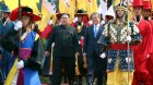 وحصل كيم ومون على باقتي ورود من صبي وفتاة من كوريا الجنوبية. وسار الزعيمان على سجادة حمراء وكان في انتظارهما حرس الشرف الكوري الجنوبي في الزي التقليدي ،فيما عُزفت موسيقى تقليدية.
