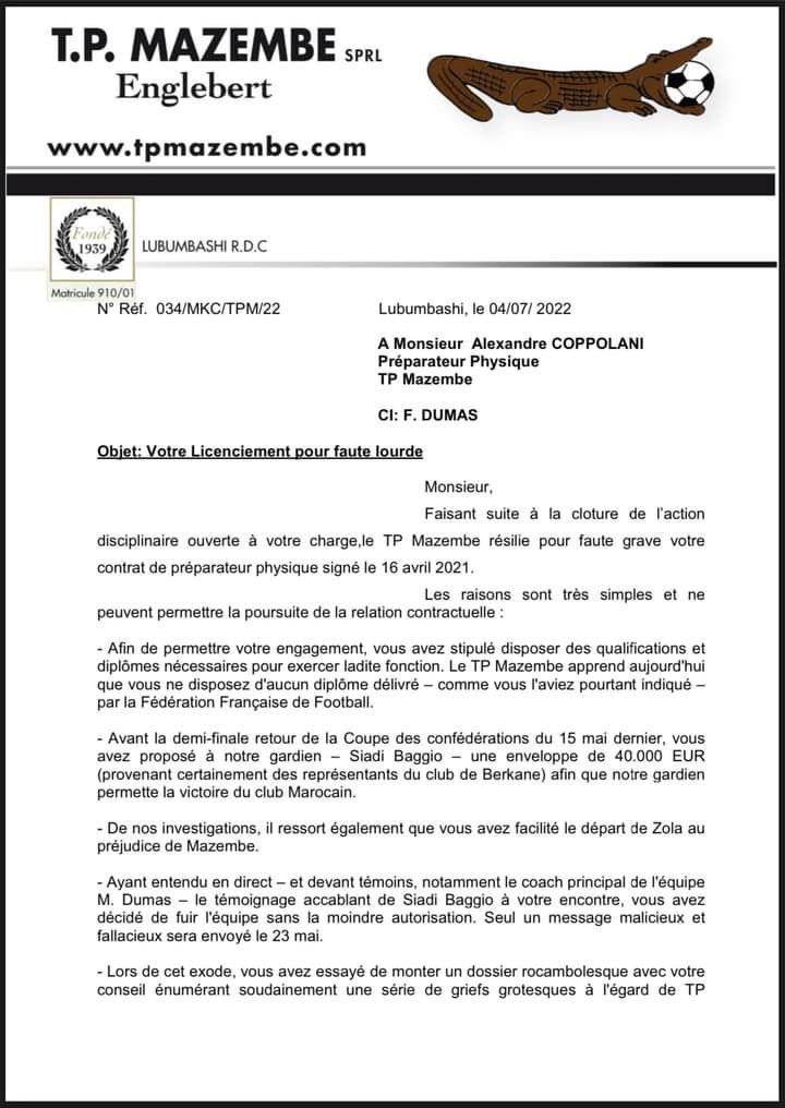 وقالت إدارة نادي مازيمبي الكونغولي في أحدث بيان لها، إنها أنهت مهام التقني الفرنسي ألكسندر كوبولاني، مدرب اللّياقة البدنية لِفريقها الكروي.