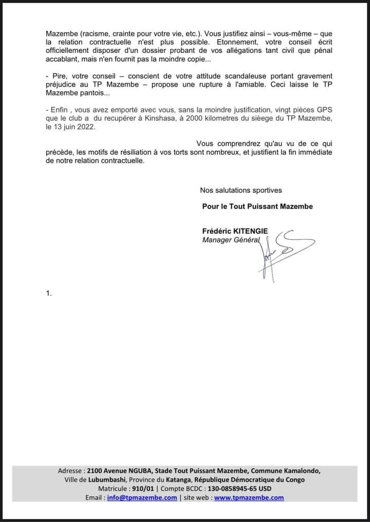 وأشارت إدارة نادي مازيمبي الكونغولي، إلى أن الرّشوة (المبلغ المذكور أعلاه) مصدرها مسؤولي نادي نهضة بركان المغربي، الذين نسّقوا في الخفاء مع التقني كوبولاني.