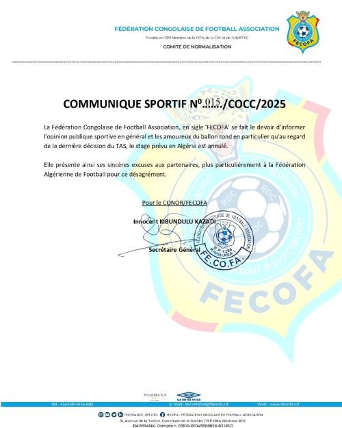 قدّم اتحاد الكرة للكونغو الديموقراطية اعتذاره إلى نظيره الجزائري، بعد إلغاء تربص منتخب بلاده للاعبين المحليين.