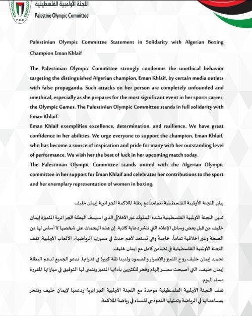 قدّمت اللجنة الأولمبية الفلسطينية، لخميس، دعمها للملك الجزائرية إيمان خليف.
