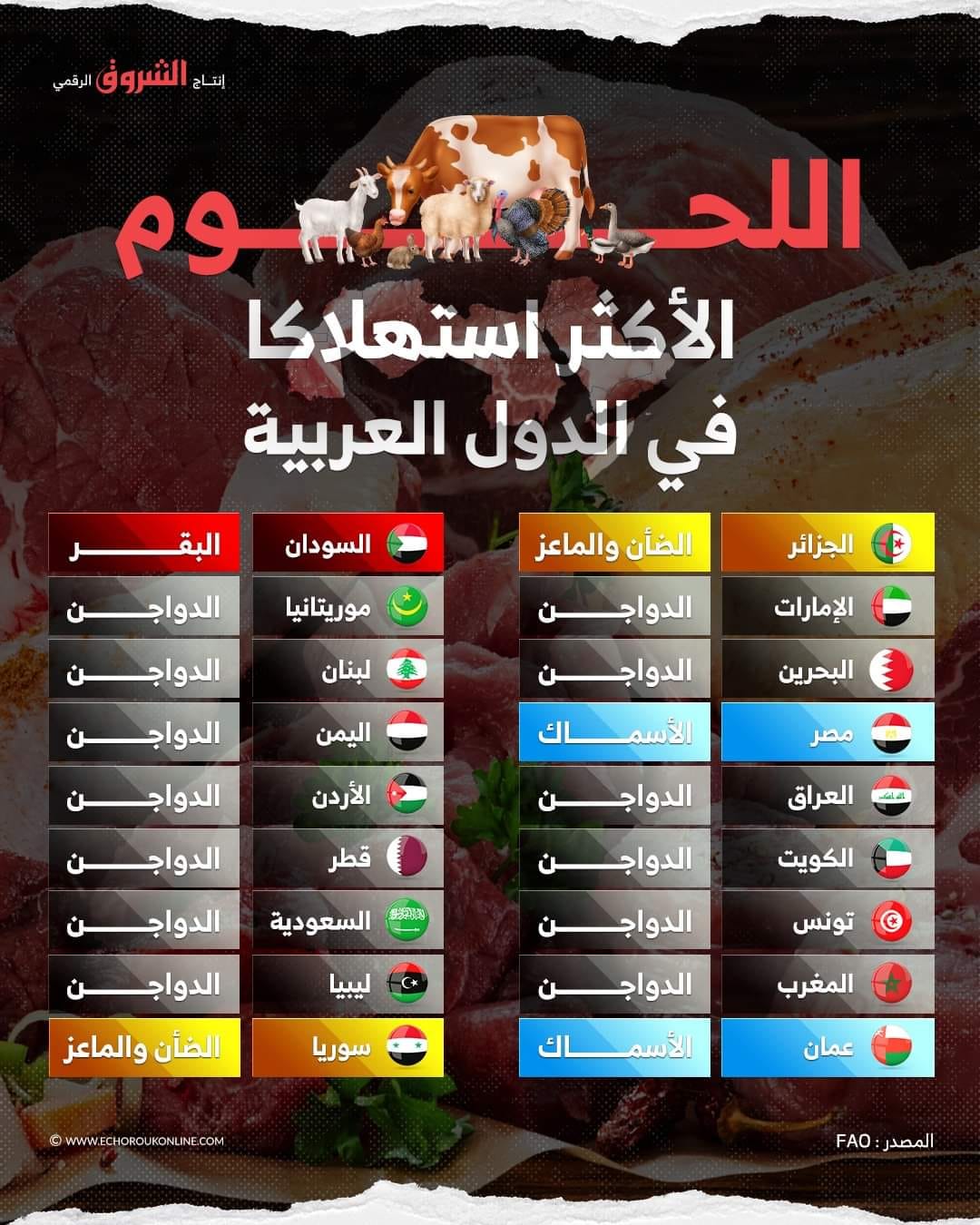 الجزائريون يفضلون لحم الضأن والماعز.. هذه هي أنواع اللحوم الأكثر استهلاكا في الدول العربية حسب منظمة الأغذية والزراعة للأمم المتحدة (فاو)