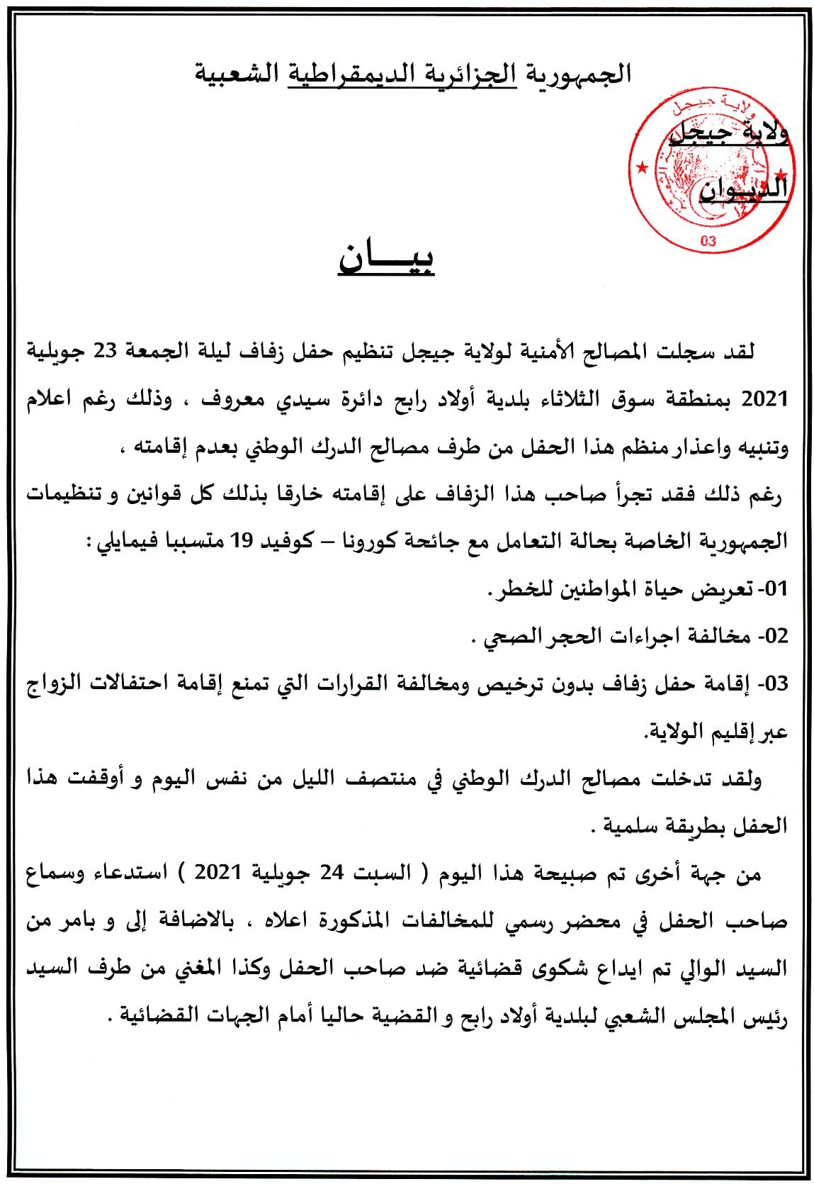 في الوقت الذي سجلت ولاية جيجل أعلى حصيلة لكورونا بـ 78 إصابة في يوم واحد خلال الجمعة، وأعلنت كل المستشفيات في الولاية امتلاءها بالحالات الخطيرة، أقيم سهرة الجمعة ببلدية أولاد رابح بولاية جيجل عرس كبير، بحضور المئات من المدعوين والفضوليين وسط اكتظاظ رهيب، مما أثار جدلا واسعا وموجة تنديد كبيرة محليا وحتى وطنيا.