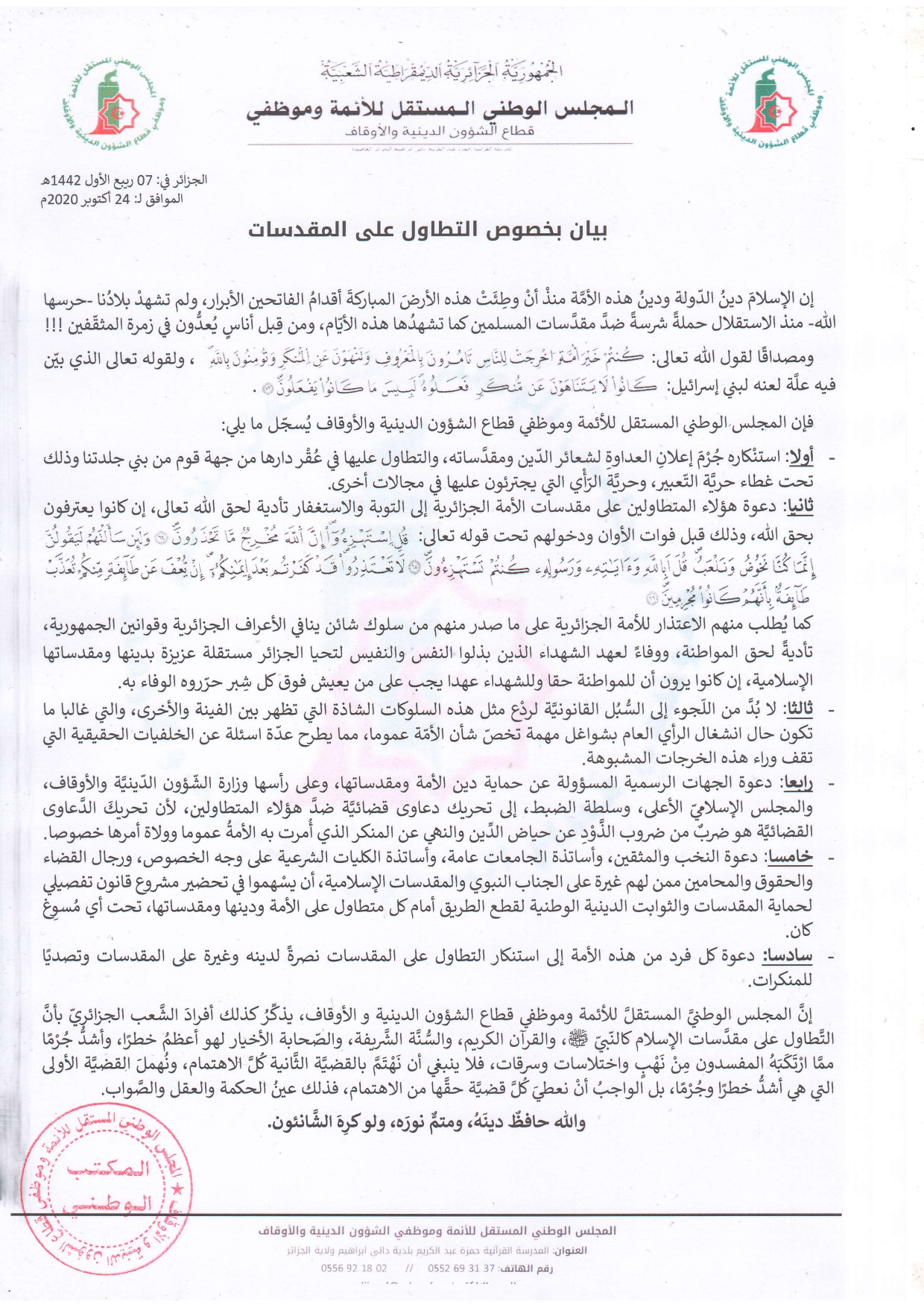 في ذات السياق طالب المجلس، المتطاولين بالاعتذار للأمة الجزائرية على ما صدر منهم من سلوك شائن ينافي الأعراف الجزائرية وقوانين الجمهورية تأدية لحق المواطنة ووفاء لعهد الشهداء الذين بذلوا النفس والنفيس لتحيا الجزائر مستقلة عزيزة بدينها ومقدساتها الإسلامية.