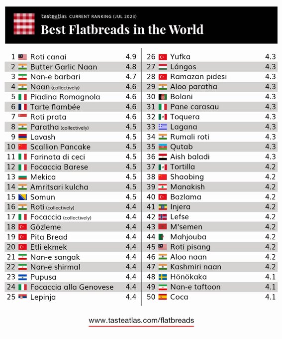 أطلق موقع “تاست أطلس” المتخصص في متابعة أخبار الأكلات عبر العالم، تصنيفًا جديدًا لأفضل خبز مسطح في العالم.