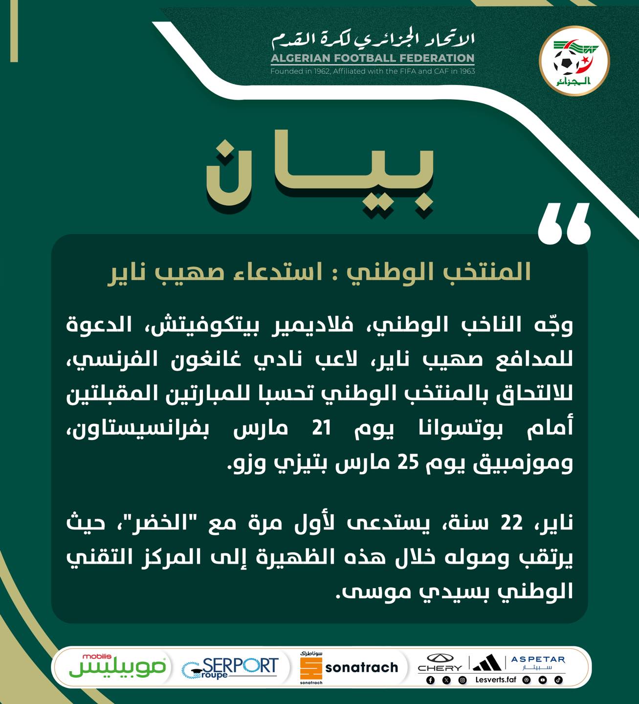 ووجه الناخب الوطني فلاديمير بيتكوفيتش الدعوة للمدافع صهيب ناير للالتحاق بتربص “الخضر”، تحسبا لمبارتي بوتسوانا وموزمبيق.