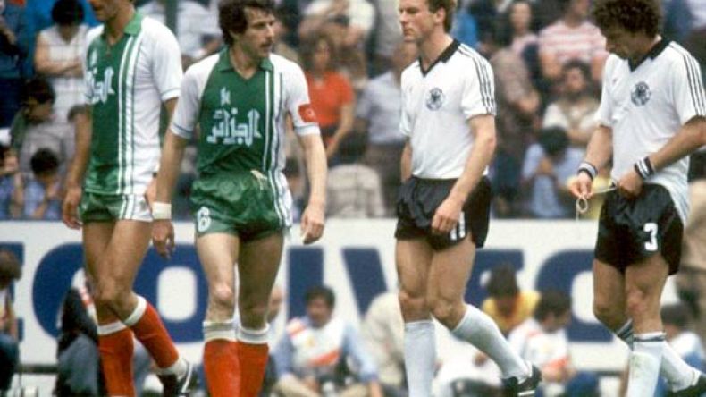 كانت ألمانيا بطلة أوروبا منذ 1980، وكانت فرصتها كبيرة لأن تكون بطلة عالمية في 1982، بسبب تواضع غالبية المنتخبات الأوروبية، ودخلت بثقة عمياء أمام الخضر، الذين لعبوا أول مباراة في تاريخهم في المونديال، وقبل المواجهة بلغ مسامعهم بعض التصريحات التي هزتهم، حيث رد المدرب ديروال عندما سألوه عن المنتخب الجزائري بأنه سيعود إلى ألمانيا مشيا على الأقدام، إن عجز عن الفوز، وأنهى المقابلة بعضّ كفه اليسرى ونشرت فرانس فوتبول حينها صورته وهو يندب خديه، كما أن رومنيغي النجم العالمي، كان قد وعد زوجته بتسجيل هدف استعراضي قد يكون الثامن في المقابلة، وتمكن فعلا من التسجيل ولكنه لم يحتفل لأن ردّ الجزائريين كان قاسيا جدا، فقاوم الجزائريون الاستفزازات وأنهوا الشوط الأول من دون أهداف وقلبوا الطاولة على واحد من أحسن منتخبات ألمانيا على مر العصور في الشوط الثاني، عندما سجلوا هدفين كان الثاني في منتهى الأناقة والجمال من كرة شارك فيها كل اللاعبين من وسط الميدان ردا على هدف رومينيغي، وضمت تشكيلة المدرب ديروال حينها لاعبين بعضهم مثل برايتنير توجوا بكأس العالم عام 1974  والبقية من طينة الكبار وعلى رأسهم ليتبارسكي وماغات وشوماخر وشتيليكي، الذين بلغوا الدور النهائي في تلك الدورة والتي تلتها عام 1986 قبل أن يحرزوا الكأس عام 1990.