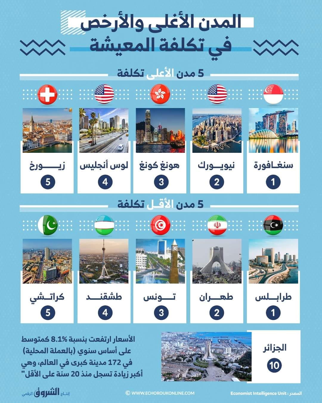 في المقابل، كان من اللافت وجود 4 مدن عربية ضمن قائمة أرخص عشر مدن للعيش في العالم.. من بينها العاصمة الجزائرية في المرتبة العاشرة.