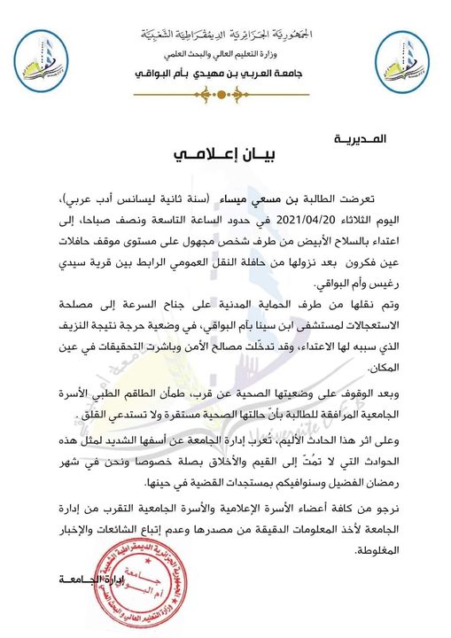 وكانت إدارة جامعة العربي بن مهيدي بأم البواقي قد نشرت بيانا بشأن الحادثة، جاء فيه أن الطالبة بن مسعي ميساء التي تدرس في السنة ثانية أدب عربي، تعرضت للاعتداء بالسكين، الثلاثاء، في حدود التاسعة والنصف صباحا.