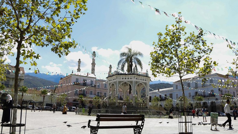 ساحة شاسعة، تنبض حيوية ليل نهار في قلب مدينة البليدة، يتوسطها معلم أثري بهندسة معمارية فريدة تتوازى فيها أقواس ست، من أيها نظرت قابلتك لوحة ظريفة.. يحيط بهذا المبنى حوض مائي تتدفق فيه ست نافورات عذبة، والمشهد من طلوع الشمس إلى غروبها، على حد قول الشاعر محمود درويش: “يحط الحمام يطير الحمام”.