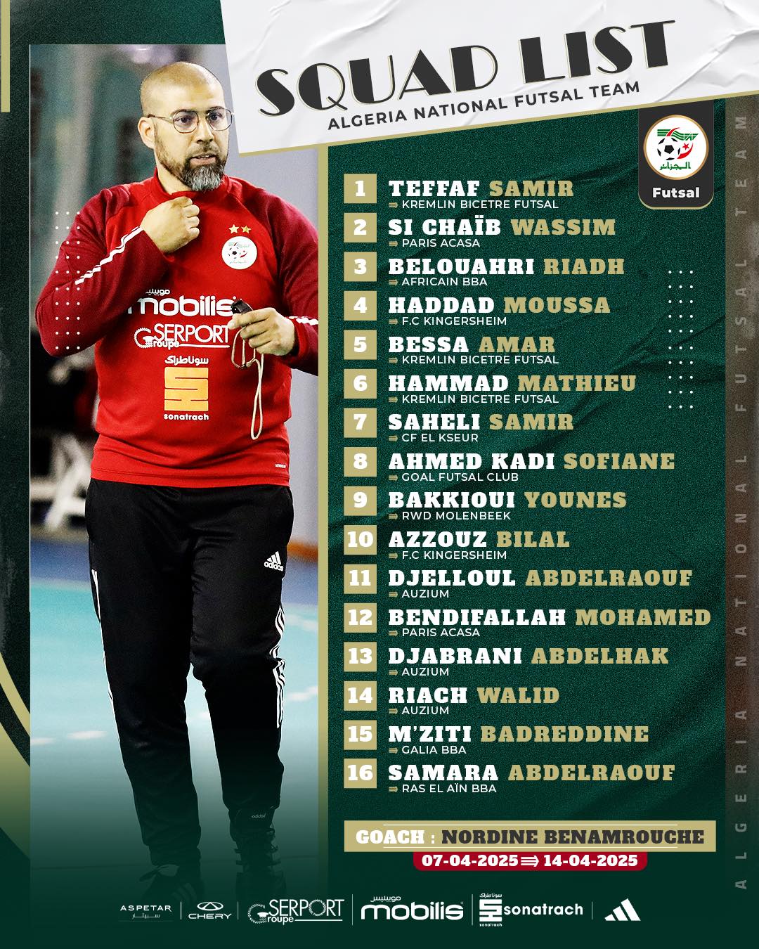 واستدعى مدرب المنتخب نور الدين بن عمروش، 16 لاعبا لهذا التربص، وتضم القائمة مزيجا من العناصر الناشطة في البطولة المحلية وأخرى تنشط في مختلف البطولات الخارجية.
