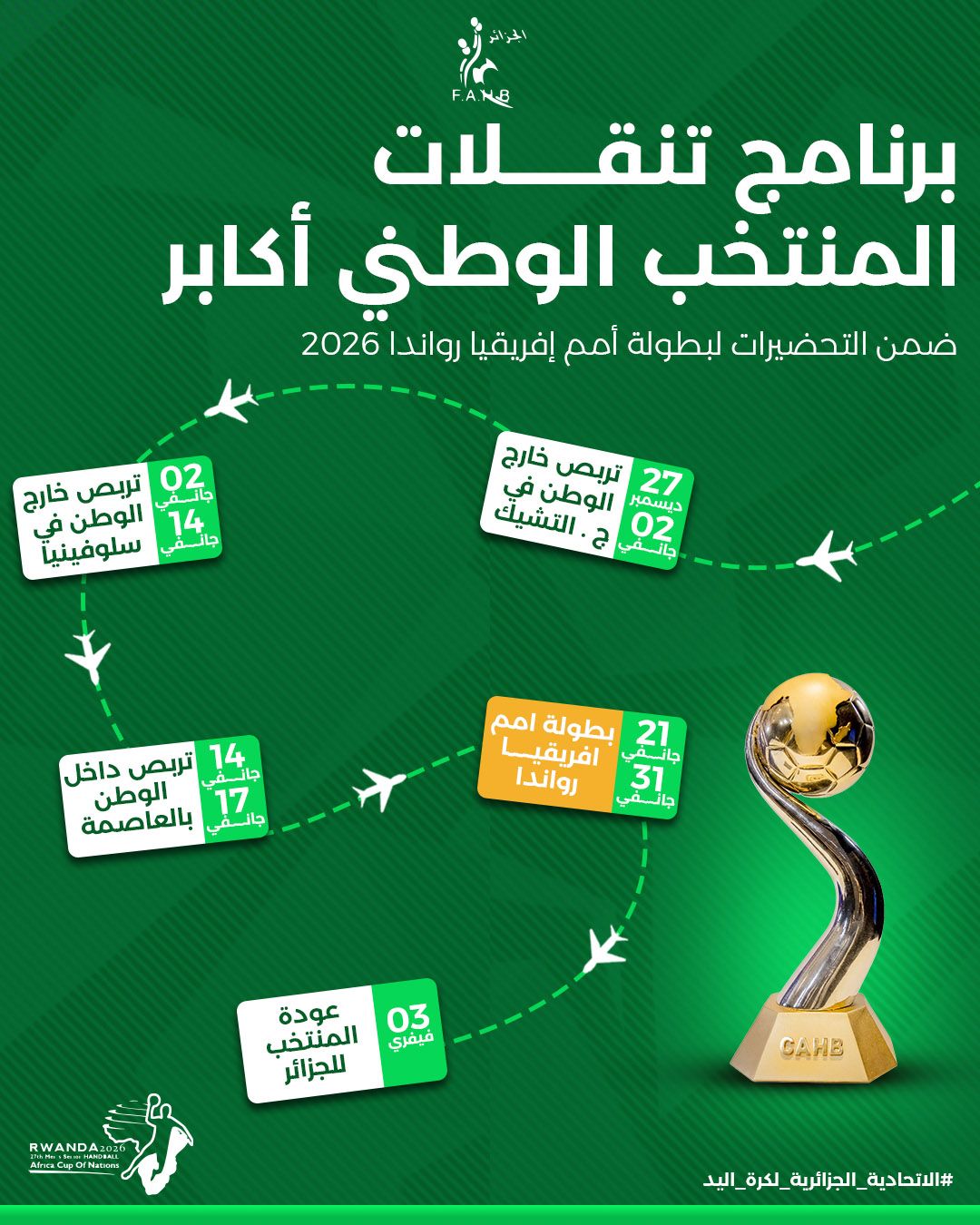 ويختتم المنتخب الجزائري تربصه الخارجي يوم 14 جانفي، ليدخل بعد ذلك في تربص قصير، قبل السفر إلى رواند، يوم 17 من نفس الشهر، للمشاركة في البطولة الإفريقية التي ستحتضنها رواندا في الفترة الممتدة ما بين 21 و31 جانفي الجاري.