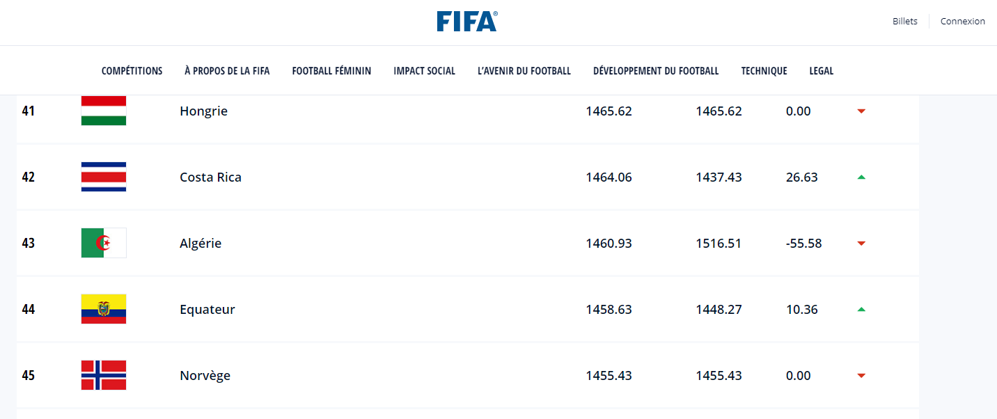 وتراجع الخضر 14 مركزًا على آخر تصنيف له، بسبب نتائجه الأخيرة، وخروجه من دور المجموعات لكأس الأمم الأفريقية، ليصبح في المركز الـ43 عالميًا.