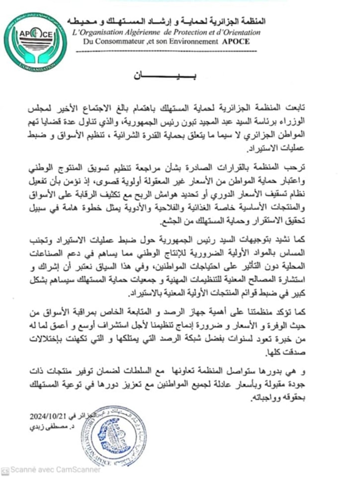 وأكدت المنظمة في بيان لها، أنها تابعت باهتمام الاجتماع الأخير لمجلس الوزراء برئاسة عبد المجيد تبون، حيث تم تناول قضايا هامة تتعلق بحماية القدرة الشرائية وتنظيم الأسواق.