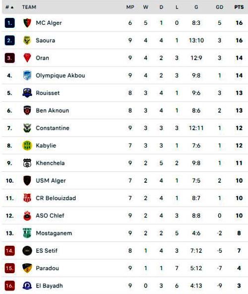 وتتفوّق مولودية الجزائر على شبيبة الساورة في الصدارة، استنادا إلى مقياس فارق الأهداف (+5 نظير +3)، كما أن فريق متوسط الميدان العربي ثابتي لا تزال تنقصه 3 مقابلات متأخّرة. بينما يحوز اتحاد خنشلة 9 نقاط في المركز الـ 11.