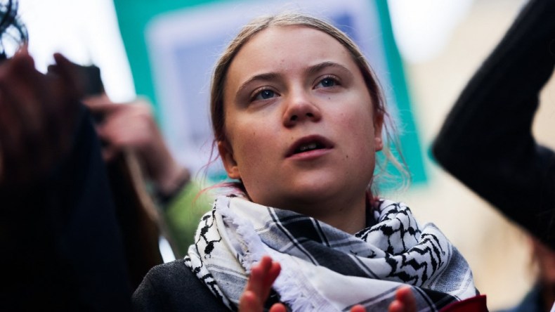 غريتا ثونبرغ بالكوفية الفلسطينية في مظاهرة في بوردو، جنوب غرب فرنسا، في 11 فيفري 2024.