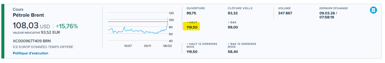 وحسب بيانات التداول، ارتفع خام غرب تكساس الوسيط بنسبة 31.4 بالمائة مسجلاً أعلى مستوى في الجلسة عند 119.48 دولاراً للبرميل، بينما بلغ خام برنت 119.50 دولاراً بزيادة قدرها 29 بالمائة. ويأتي هذا الارتفاع بعد مكاسب قوية الأسبوع الماضي، إذ صعد خام برنت بنسبة 27 بالمائة، فيما قفز خام غرب تكساس الوسيط بنسبة 35.6 بالمائة.