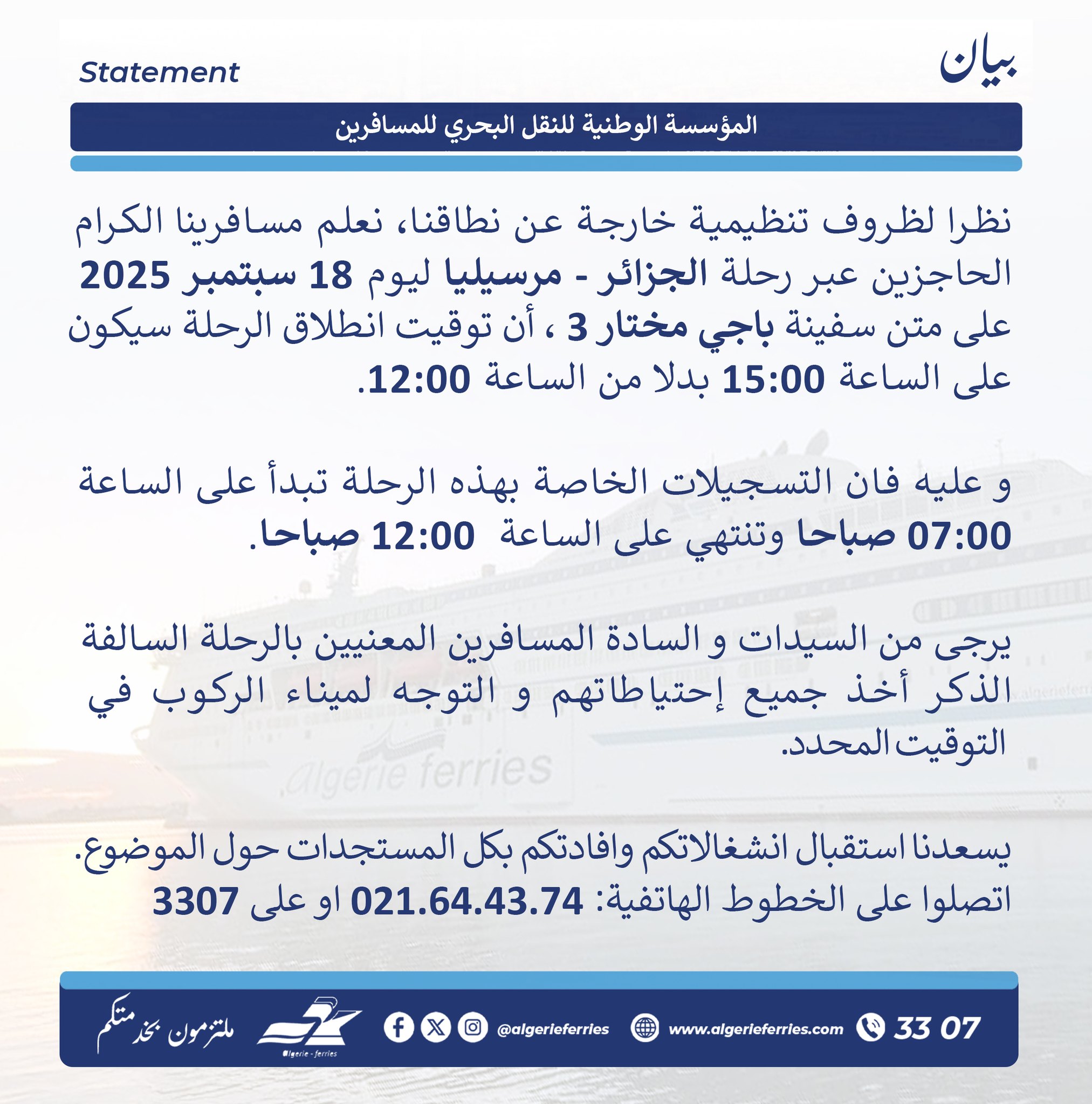 أعلنت المؤسسة الوطنية للنقل البحري للمسافرين عن تعديل في توقيت رحلة الجزائر – مرسيليا المبرمجة يوم 18 سبتمبر 2025 على متن السفينة “باجي مختار 3″، حيث سيكون الانطلاق على الساعة 15:00 بدلًا من الساعة 12:00.