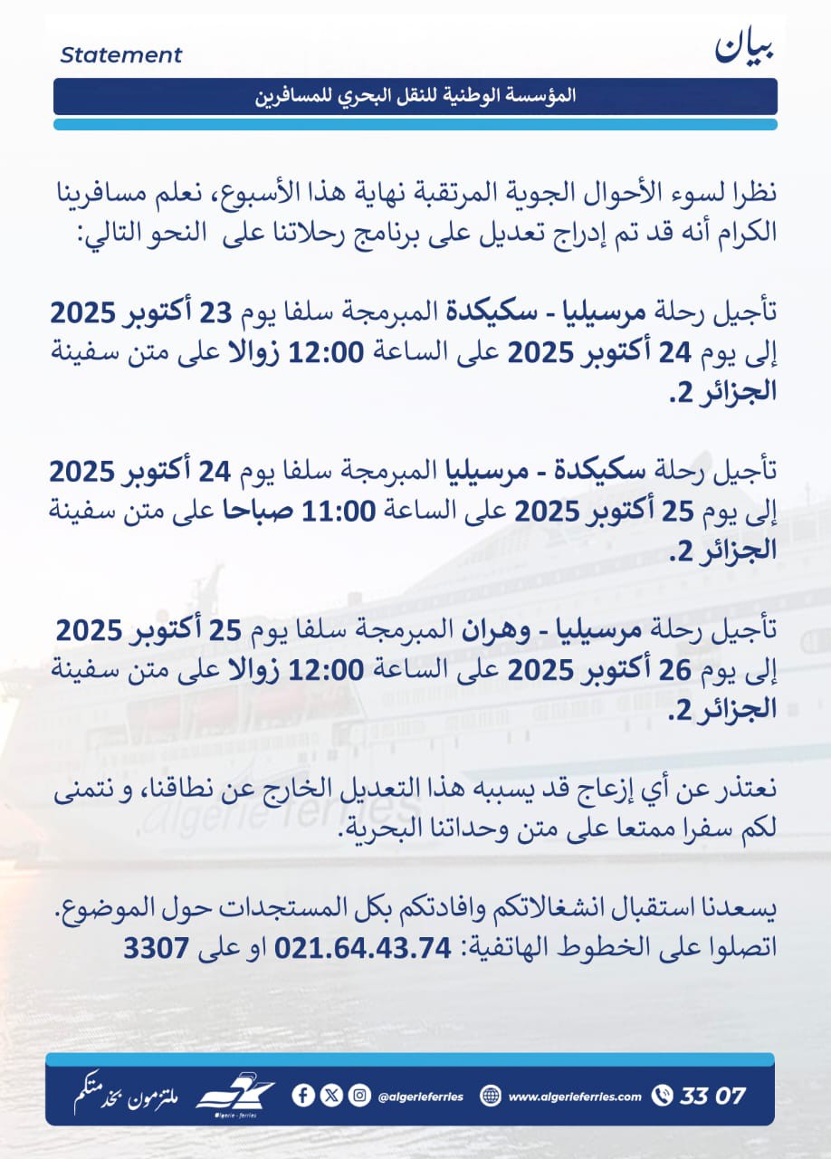 وأوضحت المؤسسة أنه تم تأجيل رحلة مرسيليا – سكيكدة المقررة في 23 أكتوبر 2025 إلى 24 أكتوبر 2025 على الساعة 12:00 زوالًا على متن السفينة الجزائر 2، كما تم تأجيل رحلة سكيكدة – مرسيليا من 24 أكتوبر 2025 إلى 25 أكتوبر 2025 على الساعة 11:00 صباحًا على نفس السفينة.