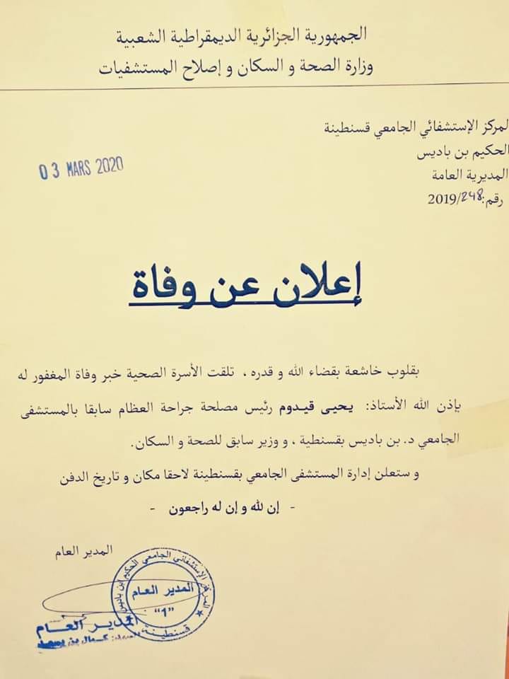 انتقل إلى رحمة الله، الثلاثاء، وزير الصحة الأسبق، يحيى قيدوم، بالمركز الاستشفائي بن باديس بقسنطينة.