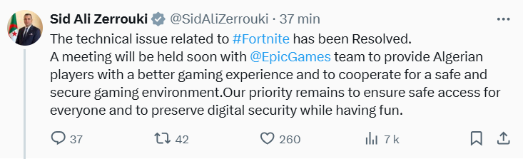 وجاء في منشور لزروقي على “إكس”:”تمت معالجة المشكلة التقنية الخاصة بلعبة Fortnite”. متابعا:”سيُعقد قريبًا اجتماع مع فريق Epic Games”.