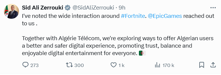 ويأتي منشور الوزير فيما يبدو ردّا على منشورات سابقة لـ”تيم سويني”، المدير التنفيذي لشركة Epic Games. تحدث فيها عن سعيه إلى “التواصل مع مسؤولين جزائريين”. بشأن ما اعتبره “صعوبة يواجهها المستخدمون في الولوج إلى اللعبة من البلاد”.