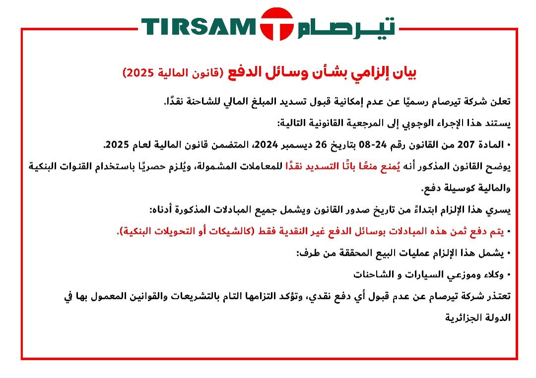 أعلنت شركة تيرصام رسميًا عدم إمكانية قبول تسديد المبالغ المالية الخاصة باقتناء الشاحنات نقدًا، التزامًا بالأحكام القانونية الجديدة المنصوص عليها في قانون المالية لسنة 2025، مؤكدة أن الدفع سيكون حصريًا عبر القنوات البنكية والمالية المعتمدة.