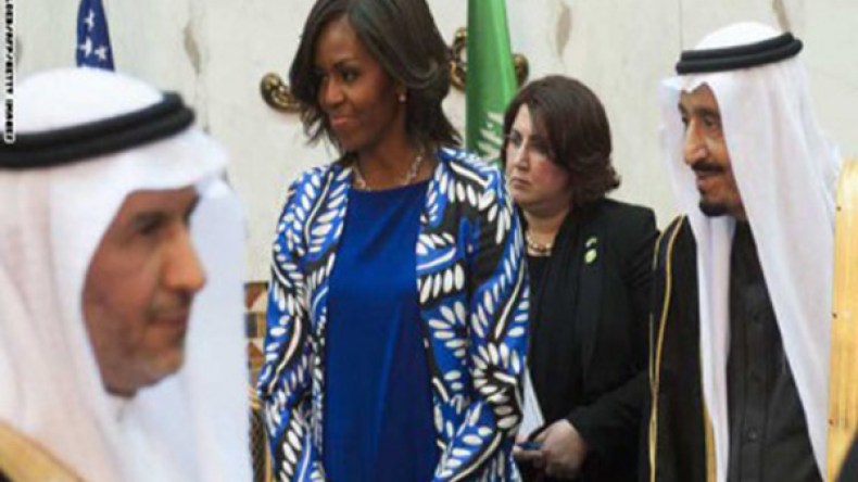 لايوجدبلدفي العالم منافق مثل السعوديةعندماارى مثل هذه المواقف يذكرني ذالك براس المنافقين ابن سلول الذي كان ظاهره مع المسلمين وباطنه مع الكفارواليهود.السعوديةادخلت جيش امريكالقتال المسلمين وكانت مع اسراءيل ضدفلسطين ثم تدعي الامتعاض من زوجةاوباما.رجال الاعمال من الاسرةالمالكةتقدم قنوات العهر والدعارةمثل روتاناوmbcثم تثيرضجةلاجل سيدتهم التى لم تسترشعرها.وفي الفقه الاسلامي لايجب على المراة ان تغطي شعرهاامام عبدهاوهؤلاءعبيدلسيدةامريكاوبالتالي فلااشكال في كشفهالشعرها