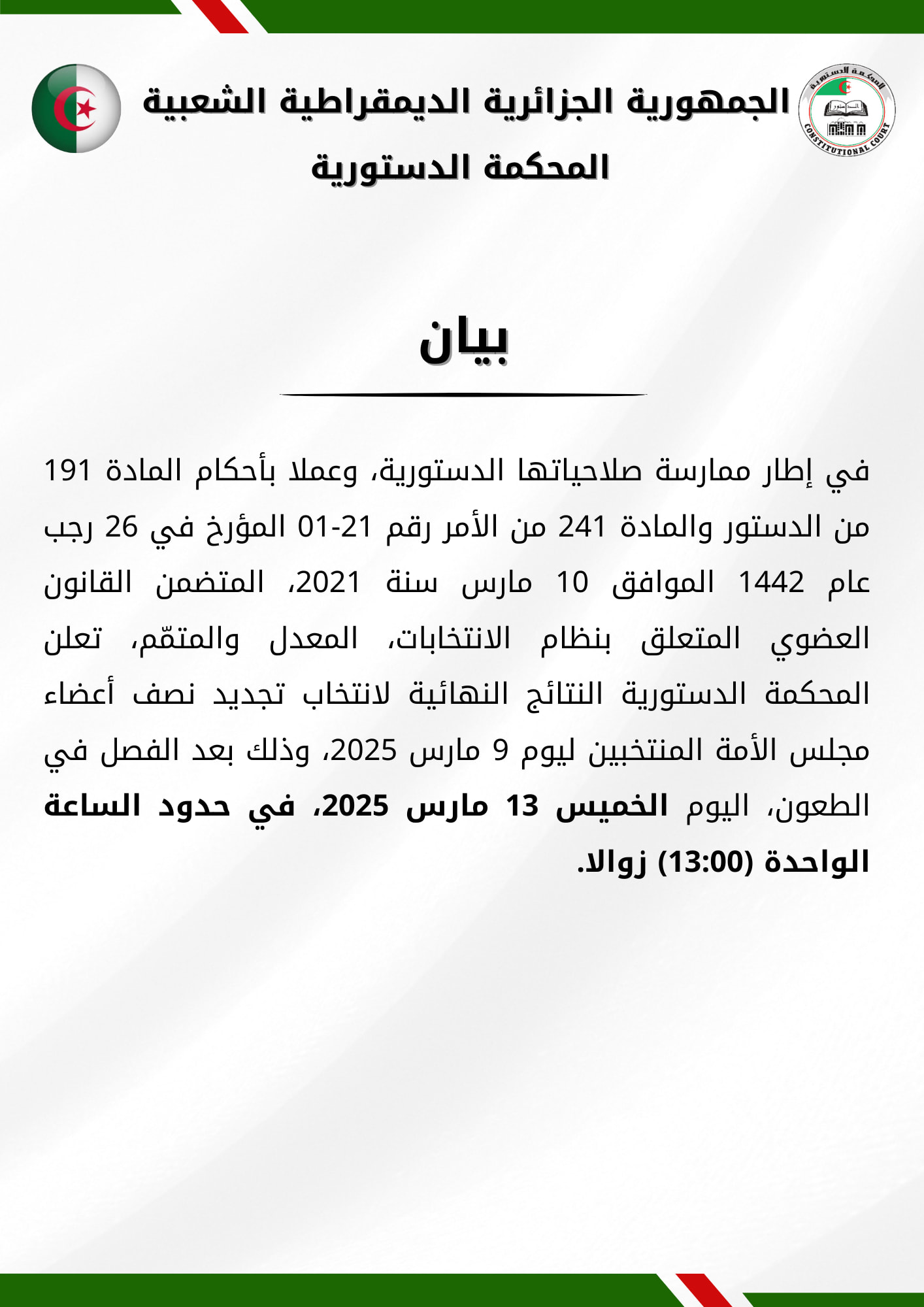 وجاء في البيان: “في إطار ممارسة صلاحياتها الدستورية، وعملا بأحكام المادة 191 من الدستور والمادة 241 من الأمر رقم 21-01 المؤرخ في 26 رجب عام 1442 الموافق 10 مارس سنة 2021 المتضمن القانون العضوي المتعلق بنظام الانتخابات المعدل والمتمم، تعلن المحكمة الدستورية عن النتائج النهائية لانتخاب تجديد نصف أعضاء مجلس الأمة المنتخبين ليوم 9 مارس 2025, وذلك بعد الفصل في الطعون, اليوم الخميس 13 مارس 2025 في حدود الساعة الواحدة (13:00) زوالا”.