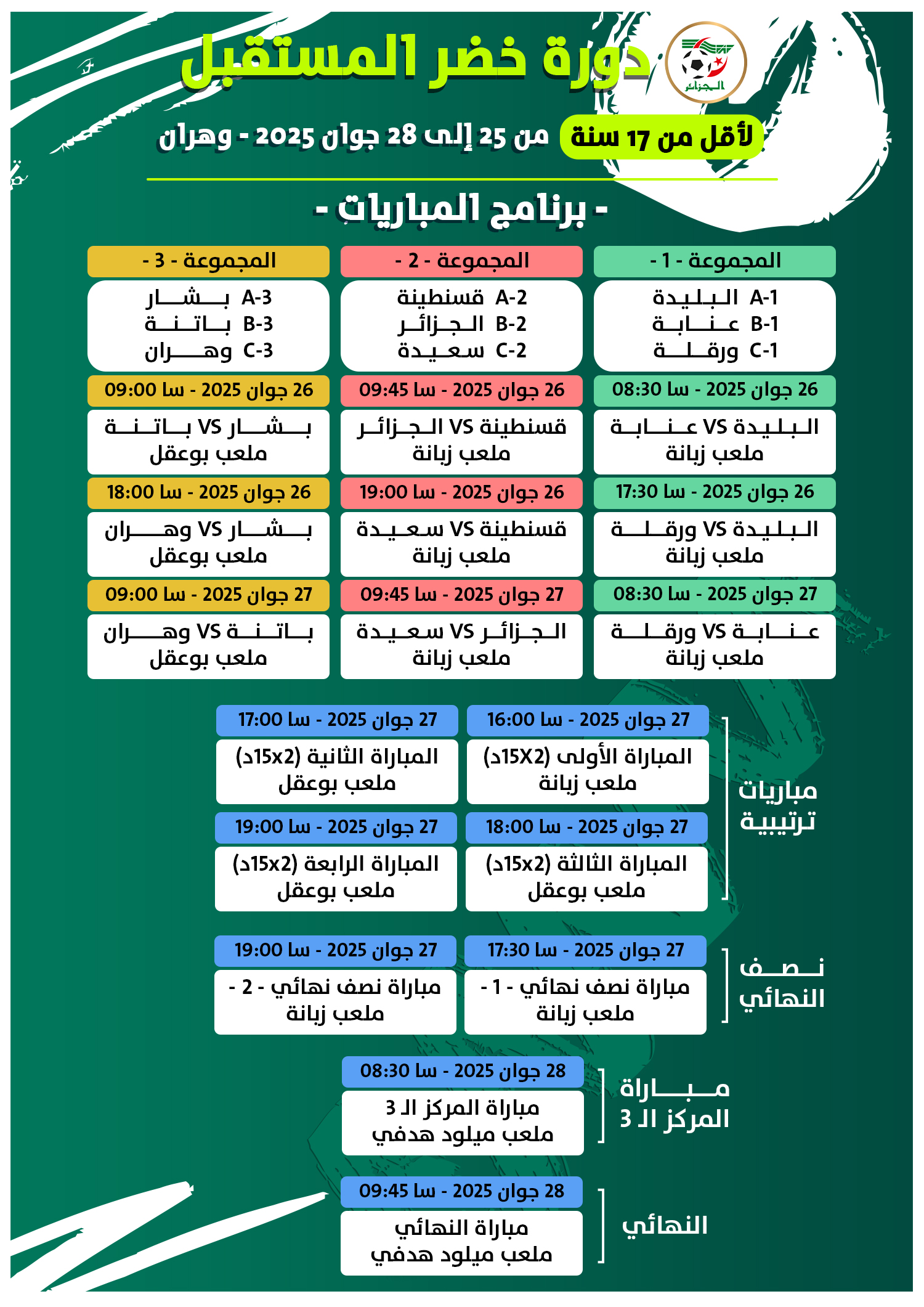 تستضيف القرية المتوسطية بوهران بداية من الخميس، دورة “خضر المستقبل” لفئة أقل من 17 سنة.