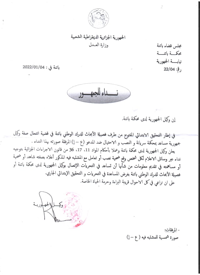 وأكدت التحريات أن منتحل صفة وكيل جمهورية مساعد كان أدعى للإيقاع بضحاياه، بأنه يملك وساطات قوية ونافذة على مستوى المحكمة العليا، كما أن زوجته تعمل قاضيا لدى مجلس قضاء باتنة. وأفضت التحقيقات الأولية التي بدأتها مصالح فصيلة الأبحاث بالتنسيق مع النيابة المحلية، بأن المتورط في النصب والاحتيال كان له عديد الضحايا بهذه الطريقة المخادعة، ليقوم وكيل الجمهورية لدى محكمة باتنة، مساء أول أمس الثلاثاء، طبقا لأحكام المواد، 11 و17 و36 من قانون الإجراءات الجزائية، بإصدار بيان للجمهور مرفوقا بصورة المتهم، موجه للرأي العام للكشف عن قضايا أخرى تورط فيها، وبحثا عن ضحايا أو شهود للمساهمة في استكمال التحقيق الابتدائي المفتتح.