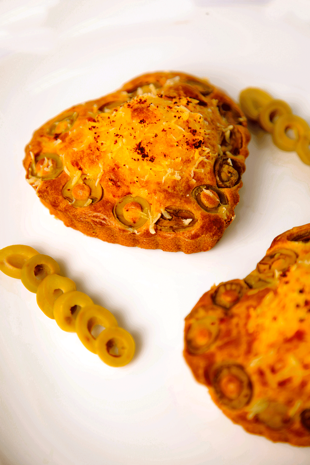 في وعاء نخفق البيض ثم نضيف الزيت ونواصل الخلط، ثم نضيف علبة الياغورتالطبيعي ونواصل الخلط، ثم نضيف الزيتون والجبن ثم الفرينة والخميرة الكيميائية والملح ونخلط جميع المقادير، ثم نفرغ الخليط في قوالب مدهونة بالزبدة ومرشوشة بالفرينةونزينها بالزيتون وندخلها الفرن على 180 ° (أنظري الصورة).