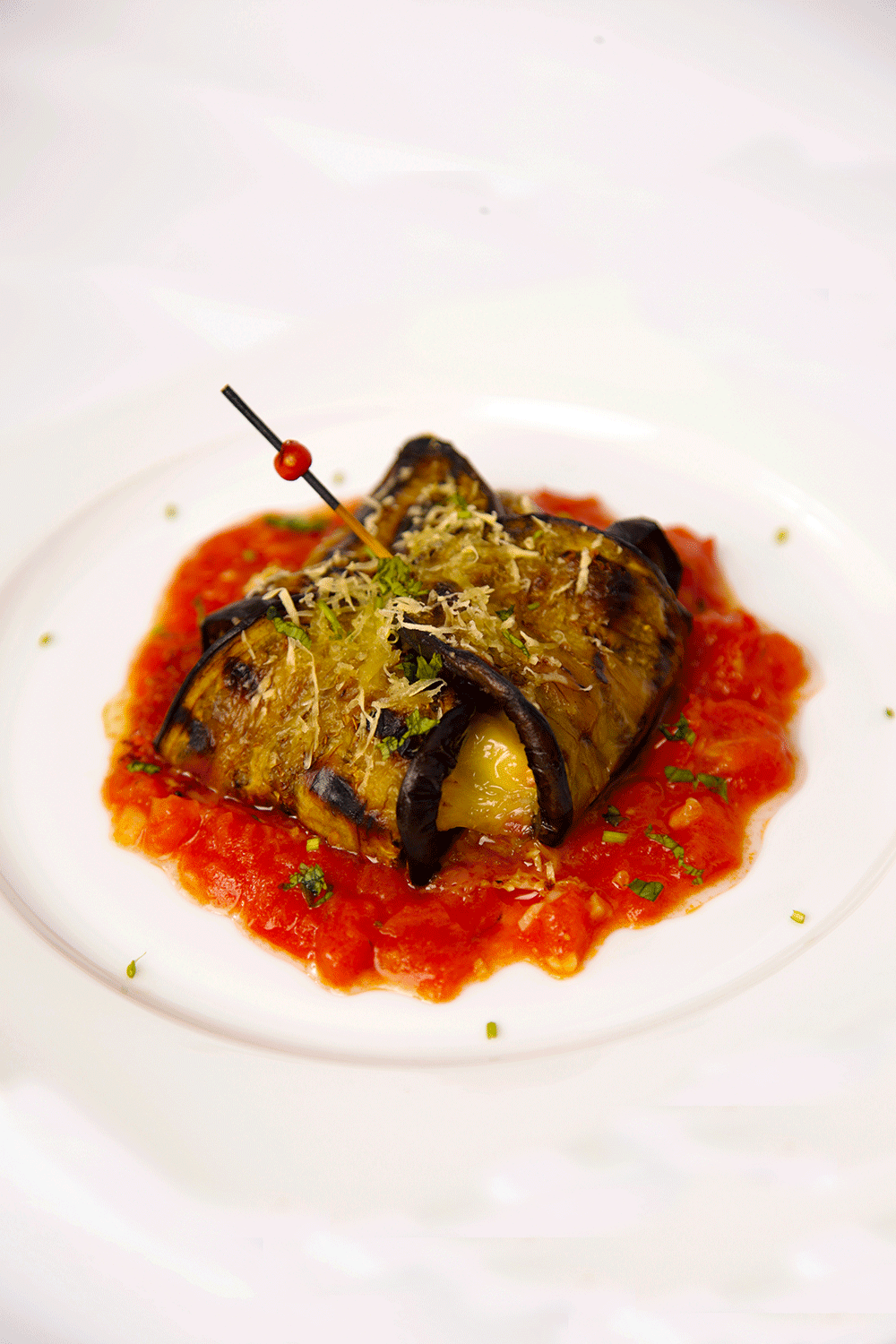 نأخذ 04 شرائح باذنجان ونضعها على شكل رسالة ونضع بداخلها قليل من صلصة الدجاج بالطماطم ثم نغلقها ونضع فوقها الجبن المبشور وندخلها الفرن كي تتحمر (أنظري الصورة).